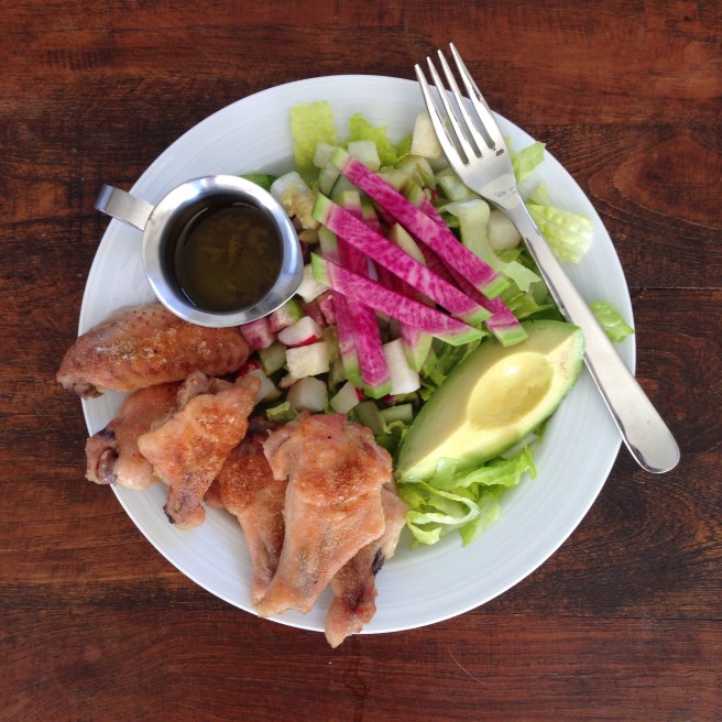- Drizzle with olive oil and sprinkle generously with salt, pepper and onion powder (we keep a mixture of the 3 in a shaker by the stove…my husband’s secret blend!) Toss the wings with the oil and spices.