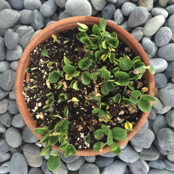Next step was doing it on purpose. I always LOVE to find purposes for something I was going to toss in the compost bin or trashcan…think Oven Roasted Leek Greens, Oven Roasted Cauliflower Leaves or Crispy Veggie Peel Curls! So the next time I was prepping carnival squash I chopped the squash in half and scooped and saved the raw seeds…I didn’t even fuss over separating them from the little bits of orange flesh I scooped from the center of the squash. I dumped the raw seeds into a clay pot filled with seed starter soil and covered with a thin layer of more soil. Within days those had sprouted too…and they were yummy. I have since tried butternut and delicata seeds and both have worked and are tasty. They are best when they are smaller, before they form “true leaves”, as they get a little fuzzy when they get larger, though still edible and certainly would be tasty as cooked greens.