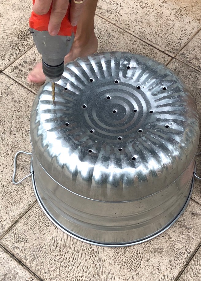 Some commercial worm bin systems have a multi-tiered structure. You fill a bottom tier completely, then start feeding on a higher tier so the worms migrate up to where food is being added. To create that additional layer, I bought a stainless bushel basket from Amazon and we drilled holes in the bottom and sides. Once the trash can was half full of composting material I put the bushel basket on top. Then I added a layer of the compost or coconut coir in the bottom of the bushel bin and started adding my food scraps in the bushel basket. Voila. The worms migrated up into the bushel basket. This allowed the lower layer to cure a bit and reduced the number of worms I needed to traumatize and relocate while harvesting. That was a WIN for me and the worms! This tweak could work with or without worms for those of you that have room for only one bin. Another note about the worms. I was hugely ghouled out about worms to begin with, but they are not nearly as icky as you may be imaging, and in fact you start to think of them fondly as your little workers who are turning trash into compost. Really!